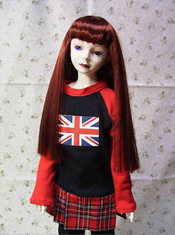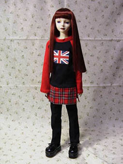 | ボンテージスーツっぽい服です。 トップスの裾(?)部分がプリーツになってます。 イギリスの国旗が可愛い! 出来ればラバーソールを合わせたいですが、 無いので厚底靴を履かせました。 そして、この状態だとウチで一番背の高い人になります。 証拠写真は上の方にあります(笑)。 |